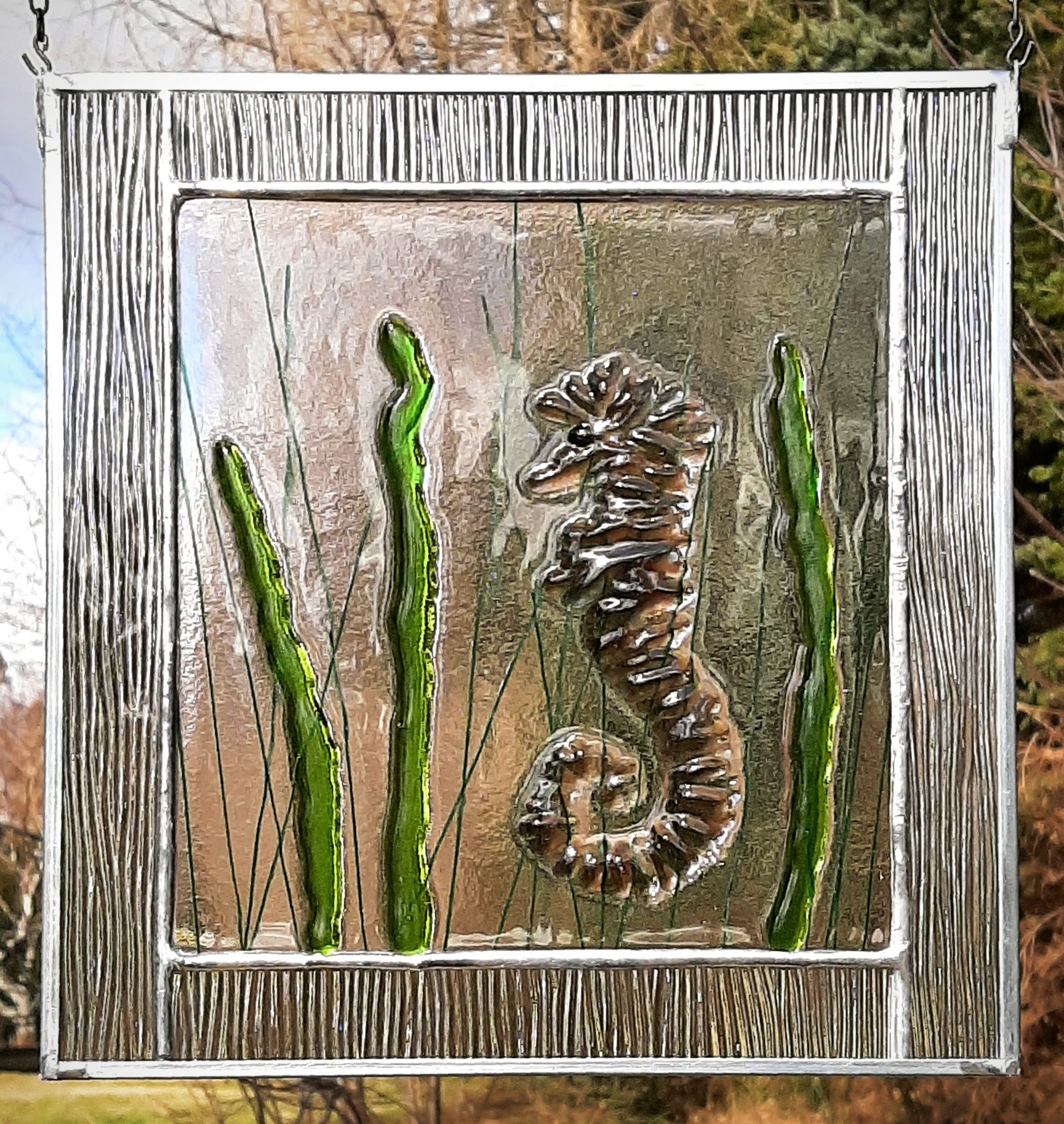 Merihevonen on kehystetty ikkunaan ripustettava Bullseye-sulatuslasitaulu.