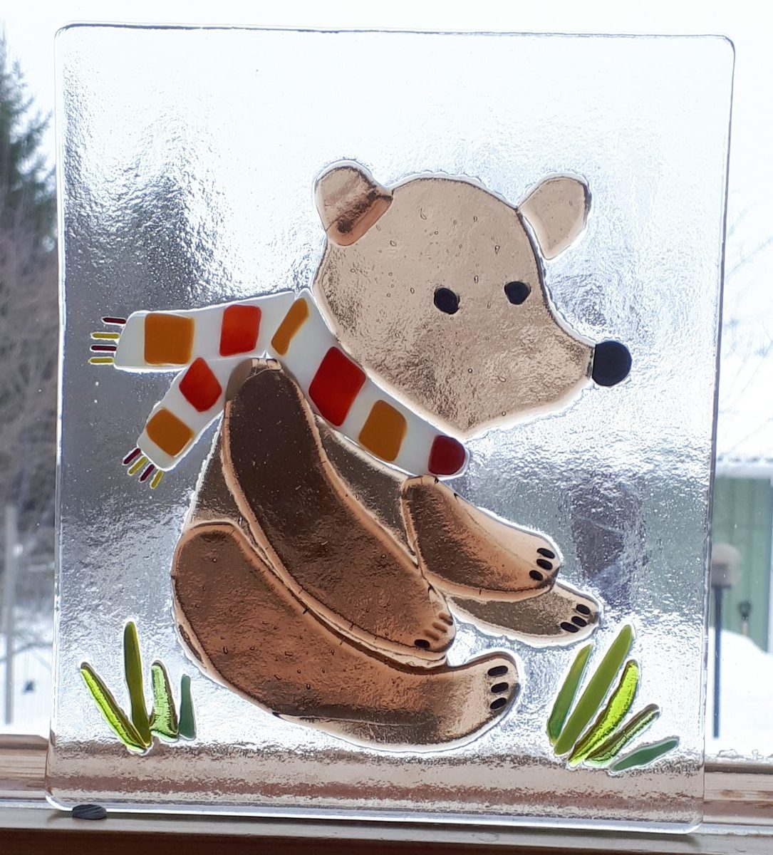Nalle on ikkunaan ripustettava Bullseye-sulatuslasitaulu. Ripustusnauha valmiiksi asennettuna.