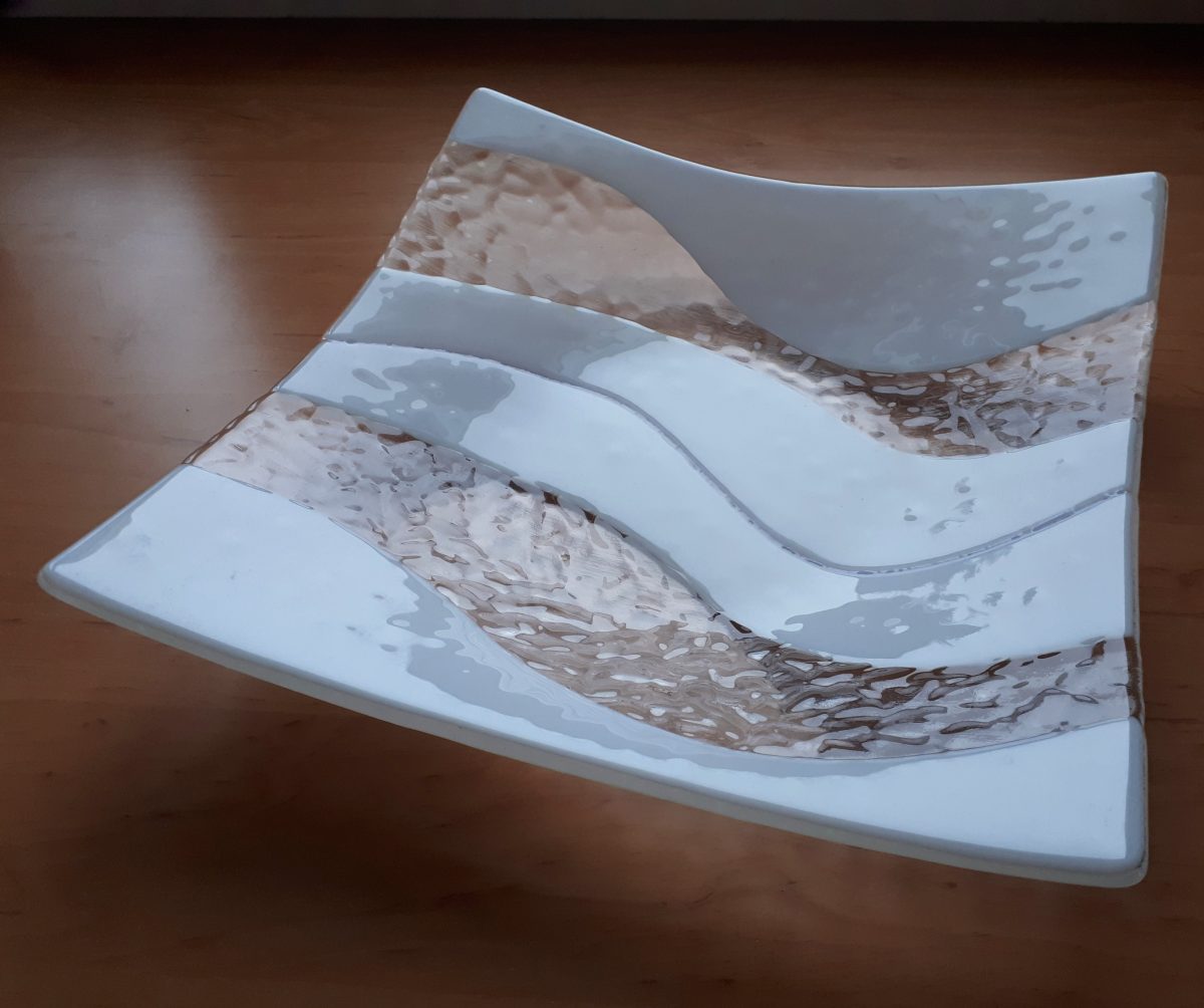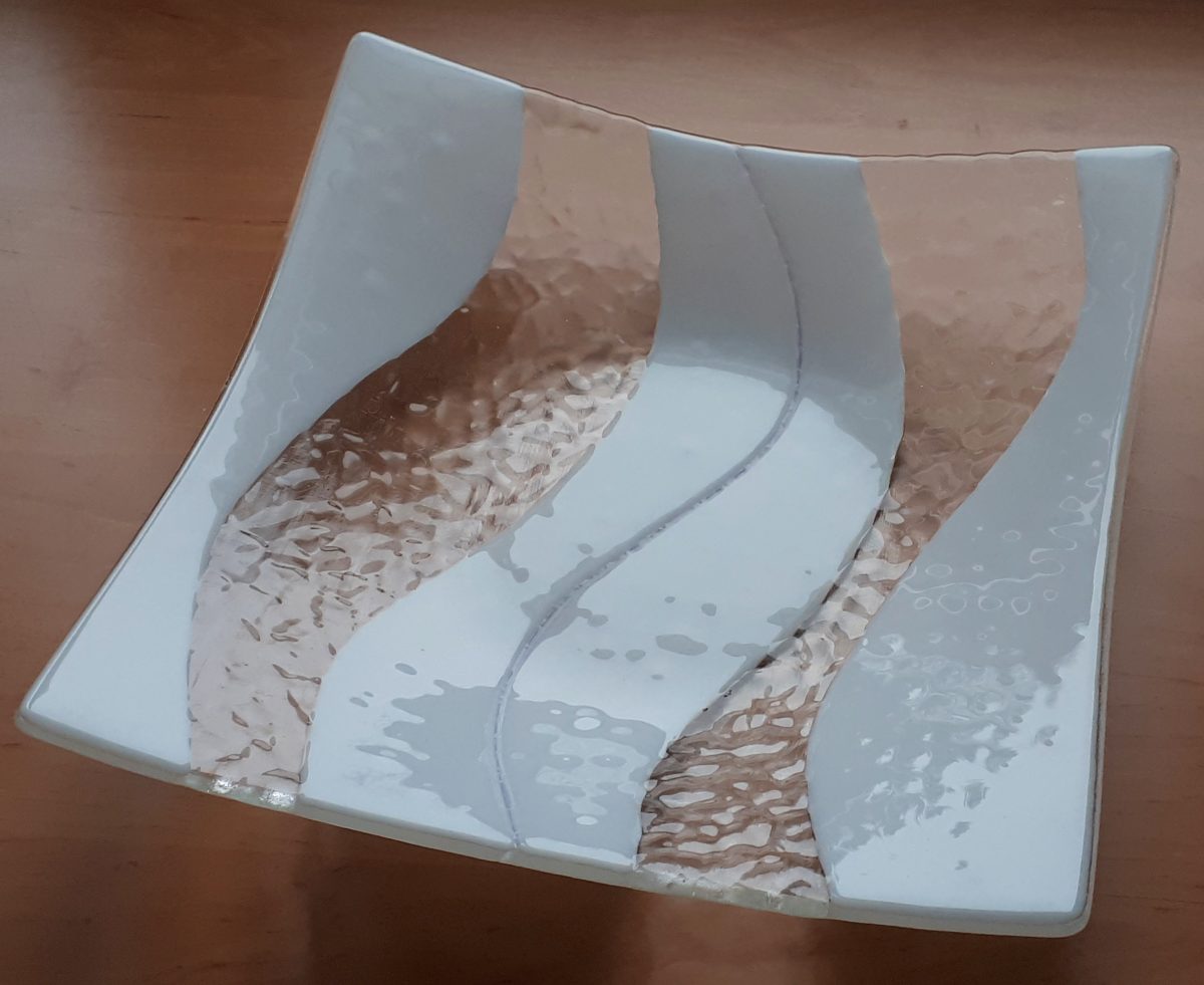 Valkokaarivati on sulatettu ja taivutettu neljästä valkoisesta aaltoilevasta Bullseye-lasivyöstä kirkkaalla Bullseye Tecta -pohjalla. Väleissä on kaksi Tecta-muruista koostettua kaistaa.
